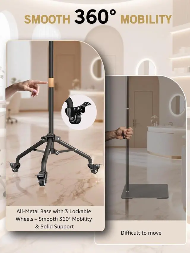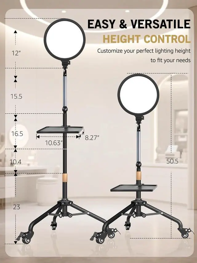 Durable Metal Stand with 3 Wheels: Designed for effortless mobility, the stand features smooth 360° wheels that let you reposition your light without lifting. Constructed from durable all-metal materials, it ensures long-lasting durability and professional reliability. With a 13-inch wide radius and lockable wheels, it combines easy portability with stable supportperfect for use in beauty salons, nail art shops, skincare rooms, makeup stationsm, lash, brow and tattoo studios
