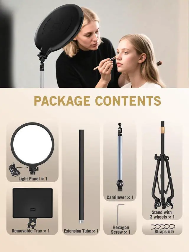 What You Can Get: 1 x 64" Stand, 1 x 10" LED Light Panel, 1 x Removable Tray, 1 x Cantilever, 1 x Extension Tube (can be added or removed to adjust height), 1 x Stand with 3 Wheels, 5 x Straps, 1 x Hexagonal Screw. For any inquiries, please contact our support team via Messaging or the way attached in instruction. We strive to respond within 12 hours to resolve your concerns.