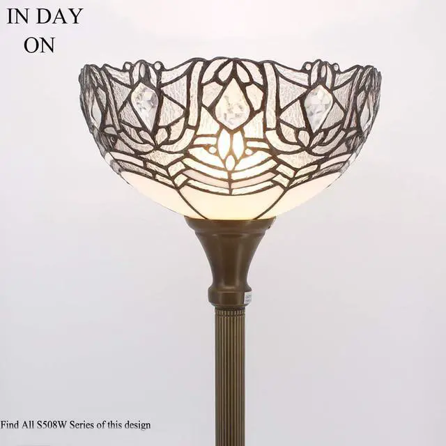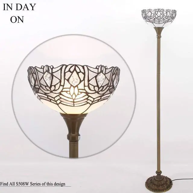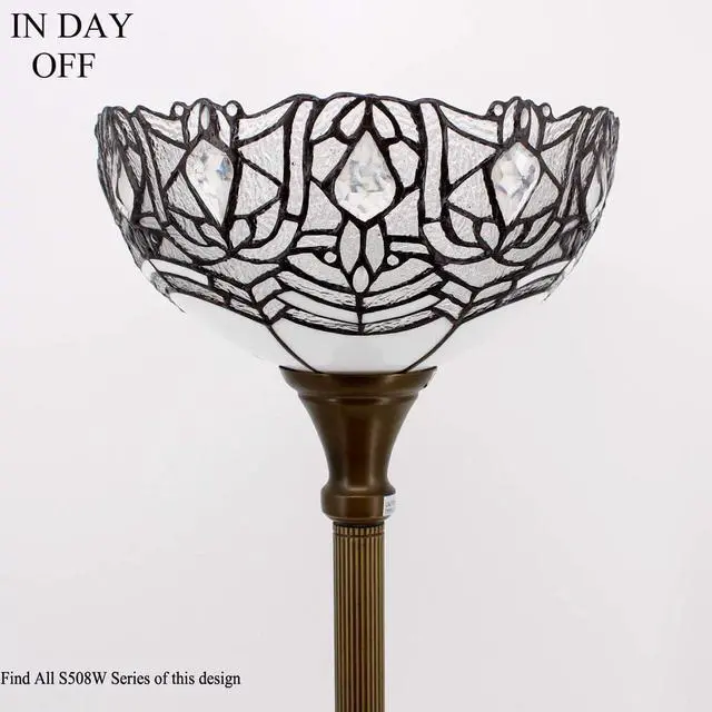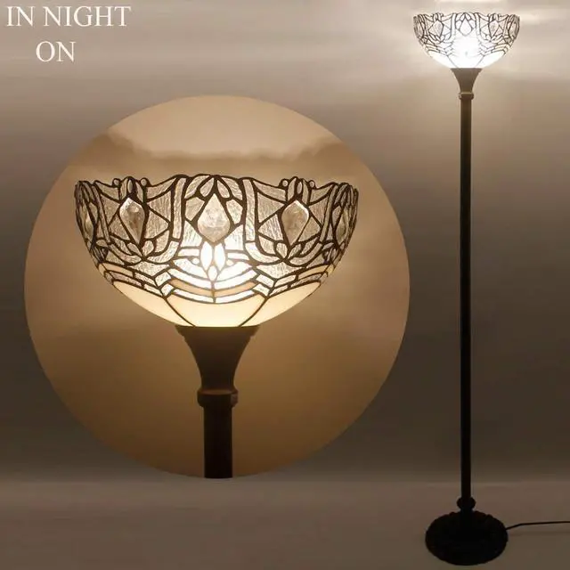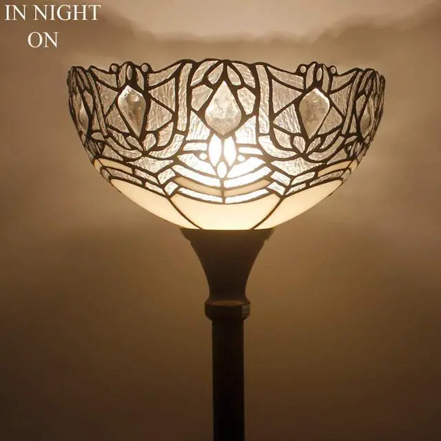 Werfactory Design: The lampshade wide 12 inch, The torchiere lamp height 71 inch. The Iron base wide 11 inch, finished with antique bronze, weight 4.3KG, provide a good stability from falling. Foot switch 43 inch far from plug, 45 Inch from base, UL listed.