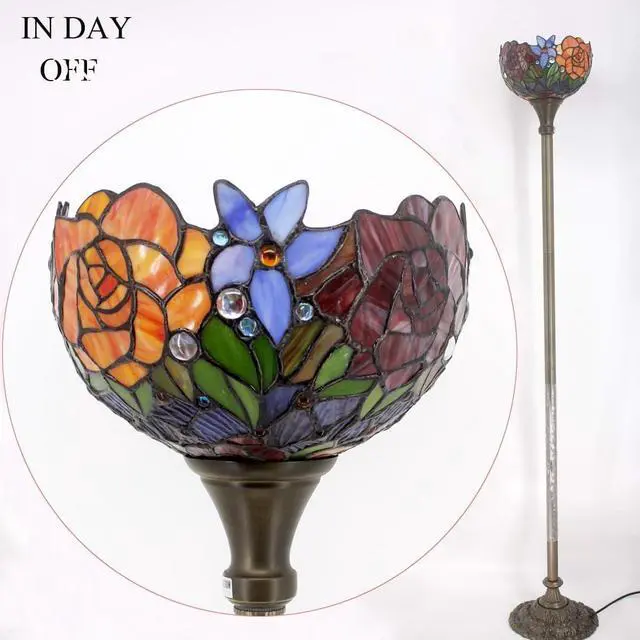 Werfactory Design: The lampshade wide 12 inch, The torchiere lamp height 71 inch. The Iron base wide 11 inch, finished with antique bronze, weight 4.3KG, provide a good stability from falling. Foot switch 43 inch far from plug, 45 Inch from base, UL listed.