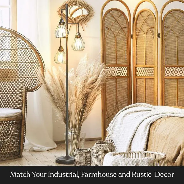 Modern Standing Lamp: This modern floor lamp is made to complement various living room décor styles, including contemporary, industrial, rustic, and farmhouse. The floor lamp has elegant lines, stunning color, and a trio of Thomas Edison-style bulbs inside gorgeous teardrop cages. The shades on the lamp have a reach of 9 and rest at 54, 60, and 66 inches on the poll. Each LED light drops 11 inches from the arms for an elegant look. The tall lamp' s total height is 68.