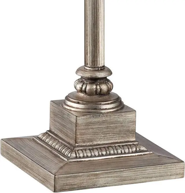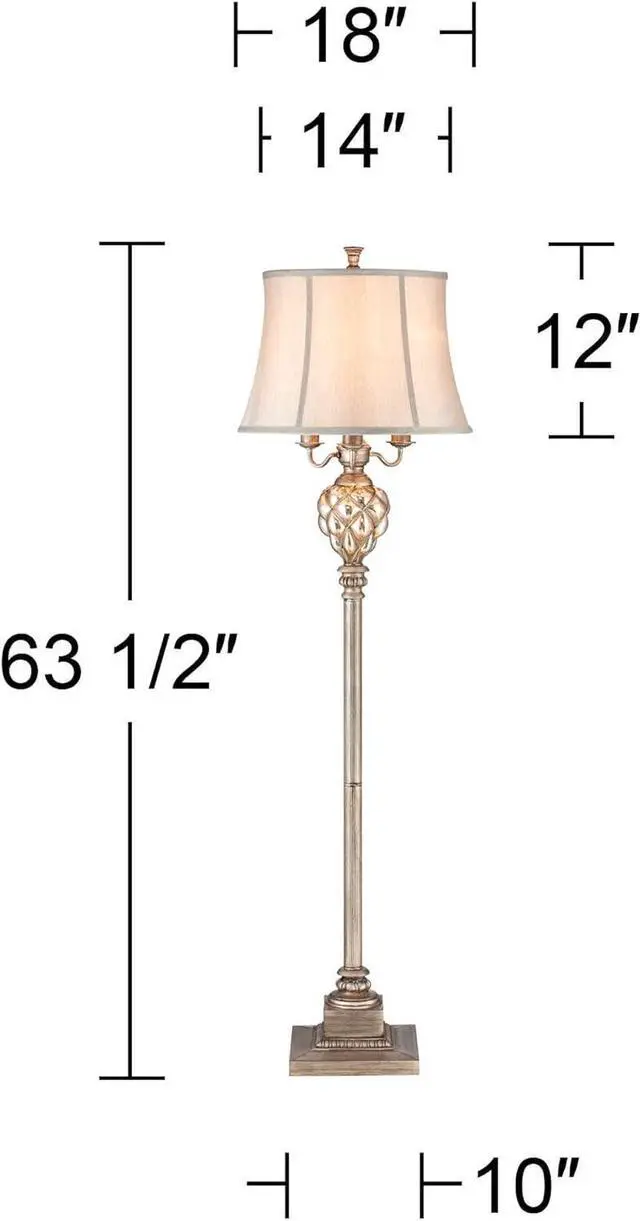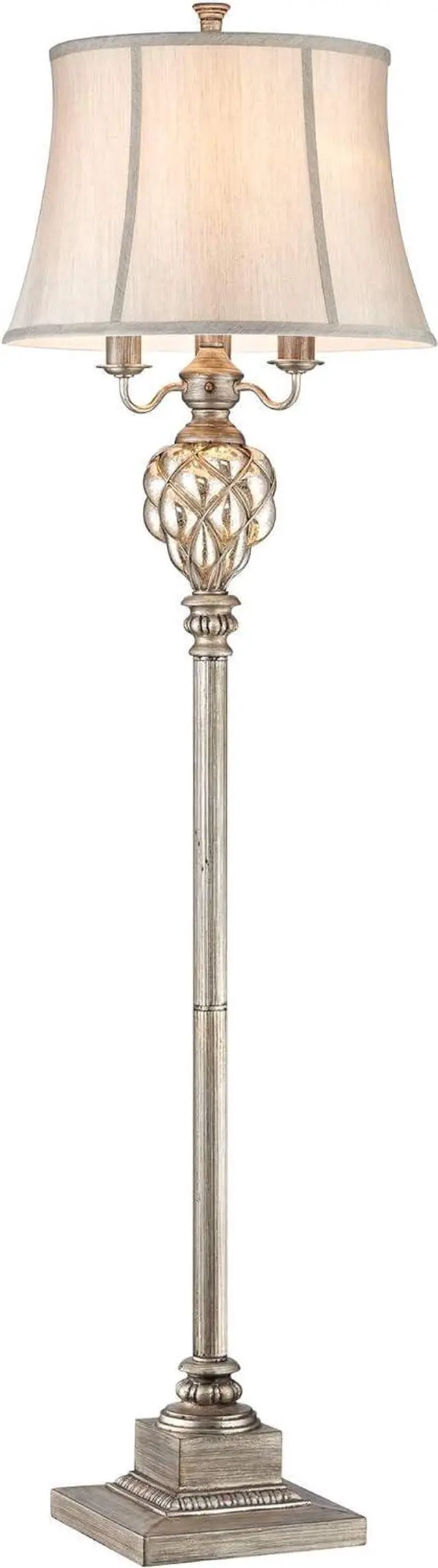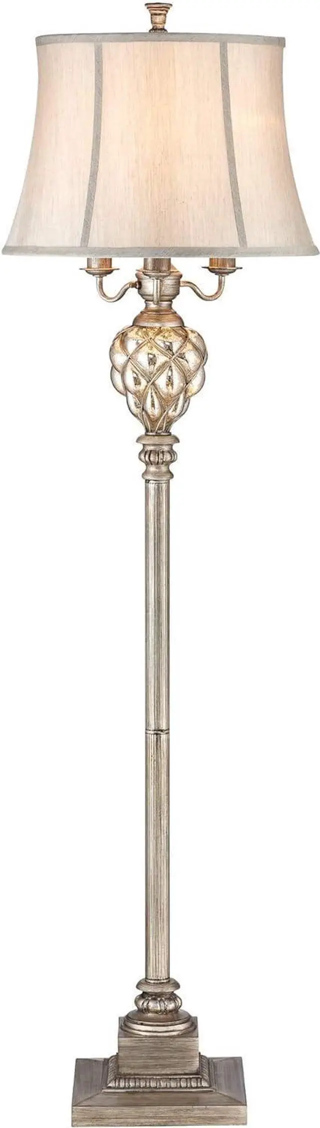 Pre-Assembled ShadesClassic 4-light floor lamp plus built-in LED night light. By the Barnes and Ivy brand. Olde silver finish. Cast resin and metal construction. Mercury glass accent. Faux silk bell shade with ribbing. 8-foot long cord.