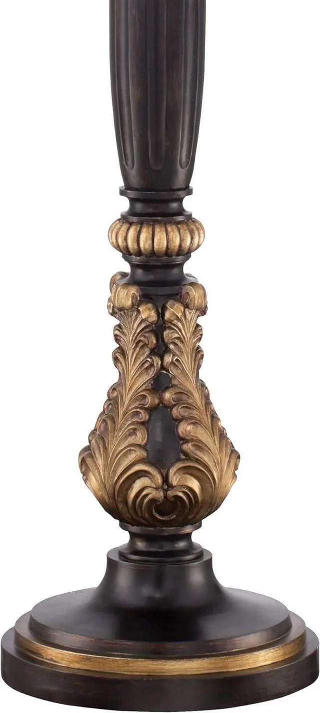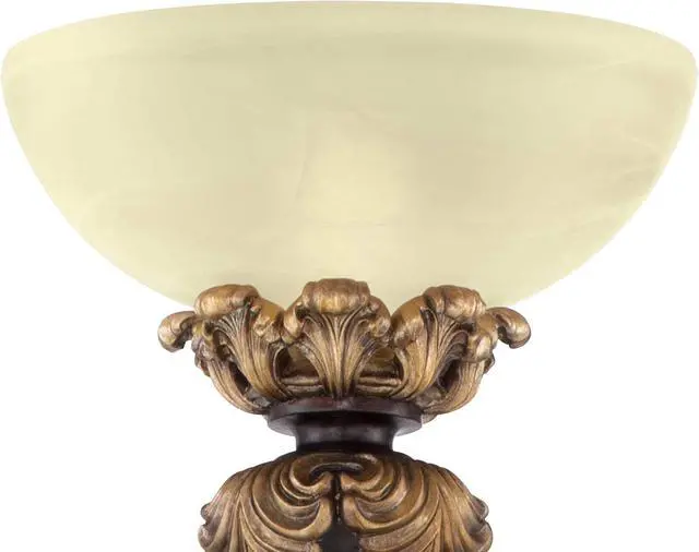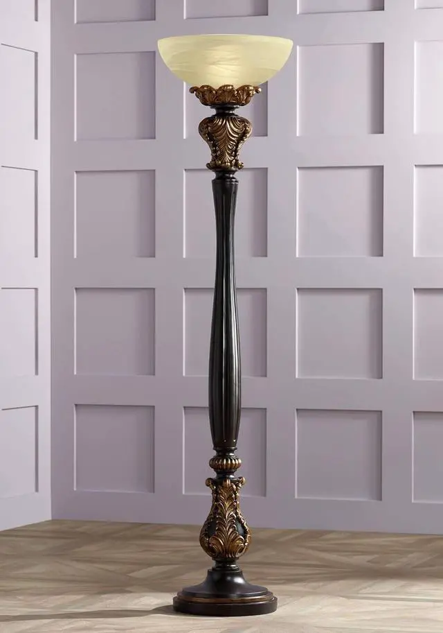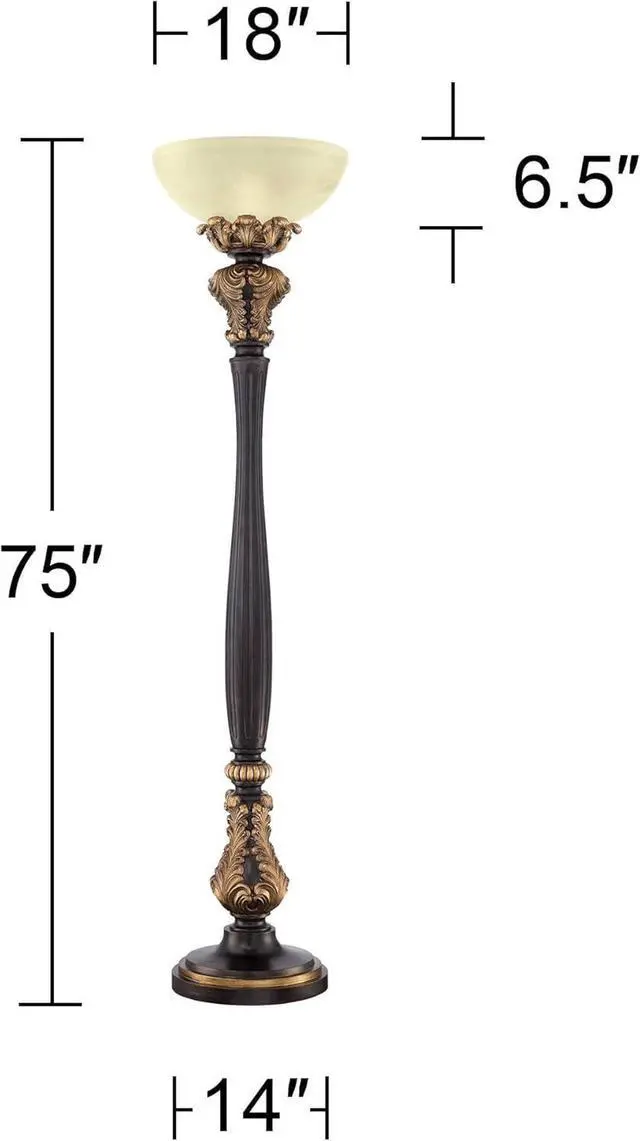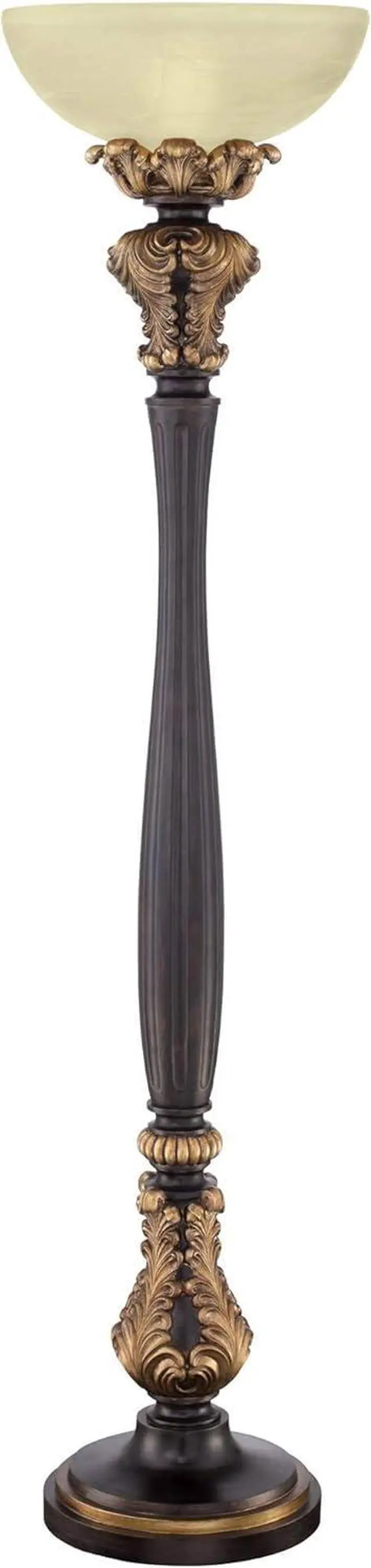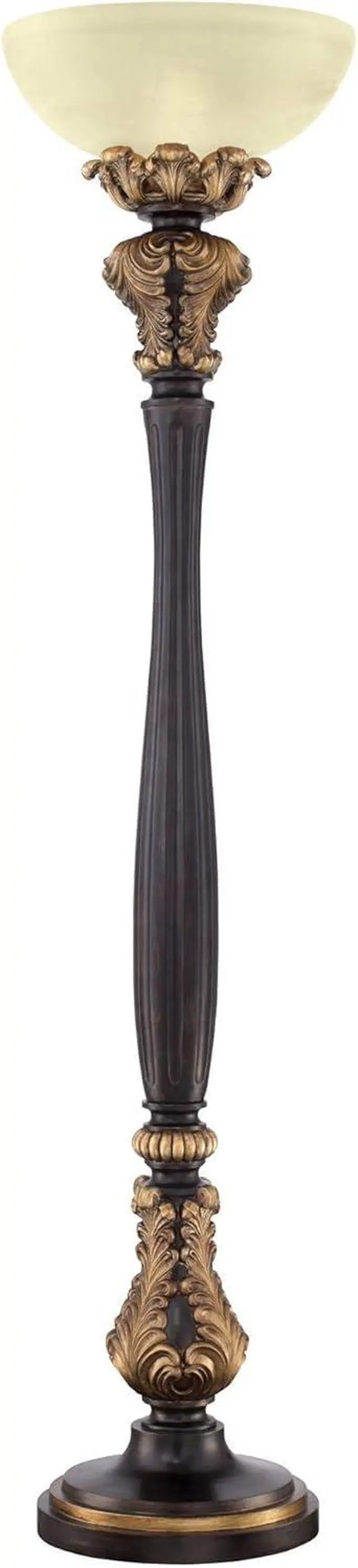 Frosted Glass ShadeAcanthus leaf and carved-look column base is in a faux wood tone finish with gold accents. Cast resin construction. Frosted glass shade. Torchiere bowl glass at top directs light upwards to ceiling for general room illumination. 8-foot long cord.