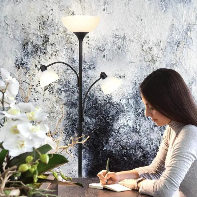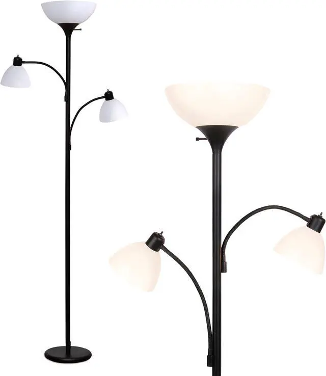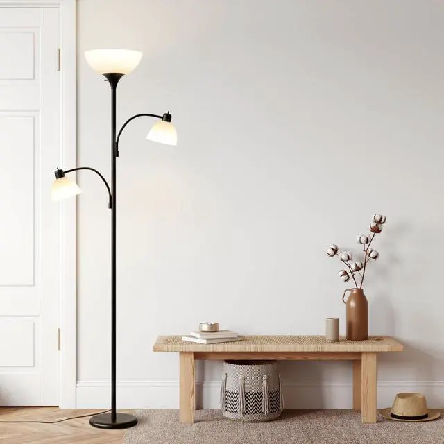 3-Way Dimmer Floor Lamp with Adjustable Arms: Designed to complement contemporary, mid-century modern, and casual décor, this 3-way dimmer floor lamp features two adjustable side arms for directional task lighting or reading, along with an upward-facing torchiere head for ambient light. The slender profile fits neatly into corners, while adjustable brightness allows for customized lighting in living rooms, bedrooms, nurseries, college dorms, and offices.