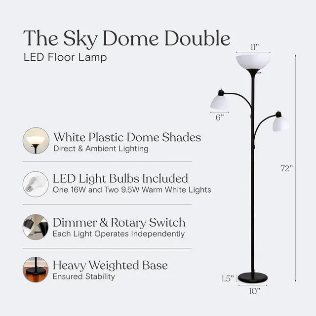 Super Bright LED Lighting: The Brightech Sky Dome Double torch lamp delivers powerful yet comfortable illumination with three LED bulbs producing a combined 3, 000K warm white light. Designed for ambient and mood lighting, this tall floor lamp provides enhanced room coverage compared to single-head torch lamps. The white plastic dome shades diffuse light evenly to reduce glare, making it an excellent alternative to harsh overhead lighting for living rooms, bedrooms, and home offices.