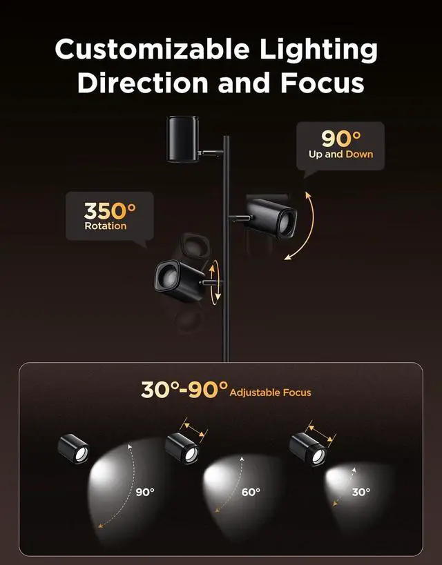 Flexible Triple-Lamp Control: This Govee Floor Lamp features 3 independently adjustable lamps. Designed with arms that rotate 350° (horizontal) and 90° (vertical). This tree floor lamp offers 30°-90° focus for wall-washing or precise lighting