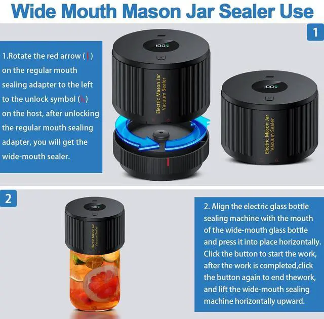 Easy to useThe cordless vacuum sealer with standard mouth sealer converter kit is suitable for wide-mouth and regular-mouth mason jars (mason jars not included). Make sure the electric vacuum sealer is centered and pressed firmly against the lid of the jar, click the button to start the vacuum pump and wait about 40 seconds or more and the air can be evacuated to the seal. Clicking the button again closes the sealer.