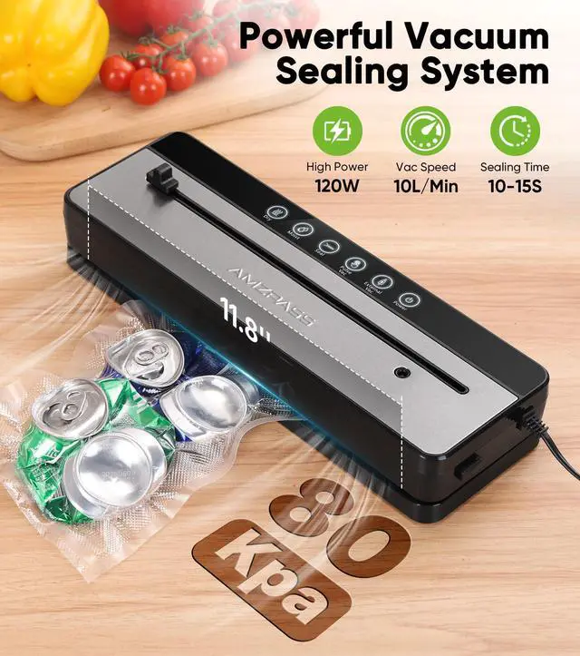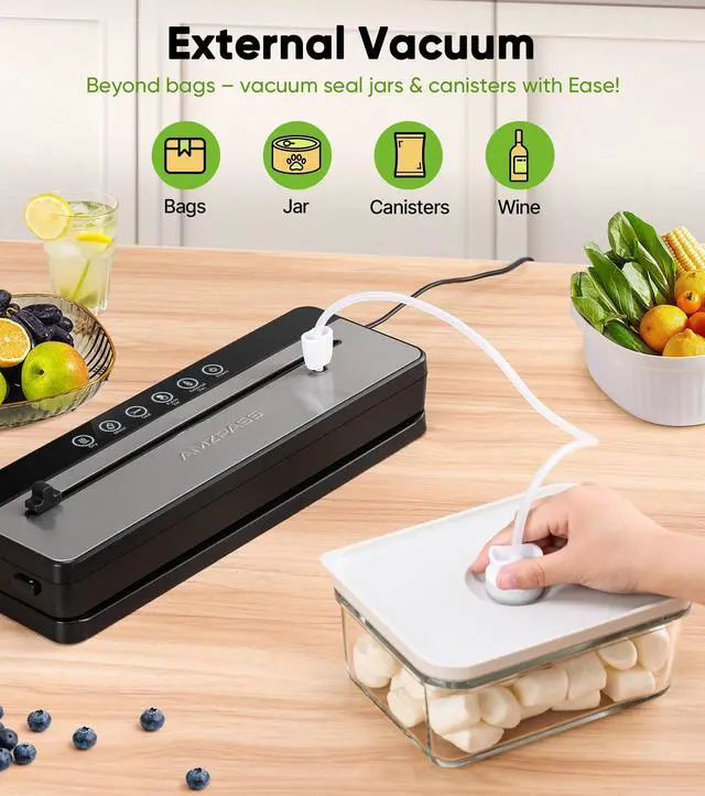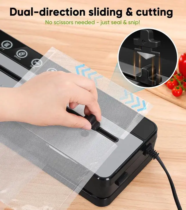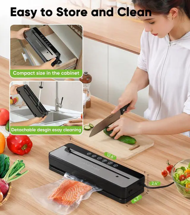 The Amzpass vacuum sealer food saver comes equipped with a built-in cutter, allowing you to easily create custom-sized bags. Eliminate waste and perfectly match your storage needsno scissors required. Enjoy eco-friendly precision for organized, efficient food storage.