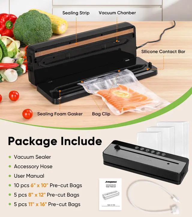 The Amzpass vacuum sealer with bags set includes: 1 compact vacuum sealer, 20 vacuum sealer bags (10pcs 6"x10" + 5pcs 8"x12"+ 5pcs 11"x16"), 1 external suction hose, and 1 user manual. Simplify cooking and meal prep with this all-in-one solution, ideal for both beginners and pros.