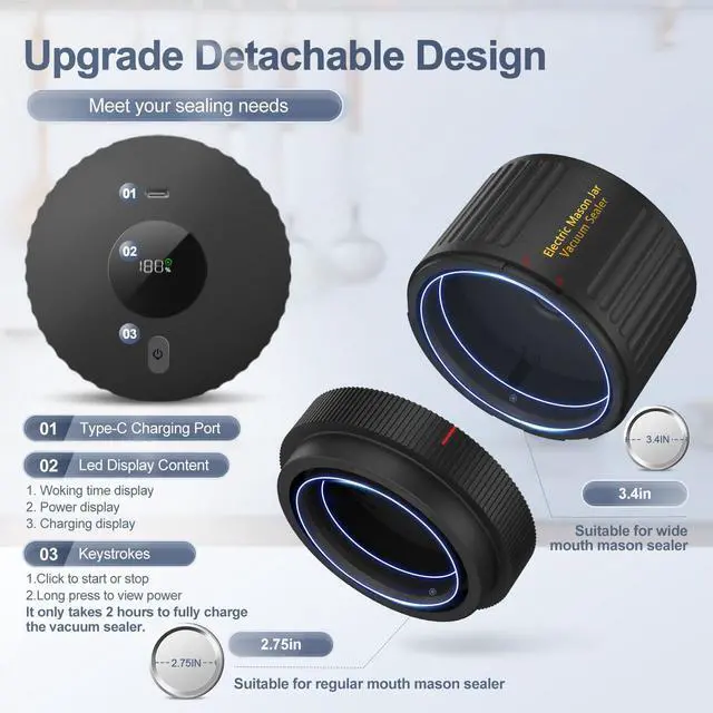 Free Your Hands with Electric Jar Sealer No more manual pumping or struggling with multiple accessories. Our electric vacuum Jar Sealer allows you to seal your Mason jars with just one hand, leaving the other hand free to hold the jar steady. It's the perfect solution for busy home cooks who want to save time and reduce clutter in the kitchen.