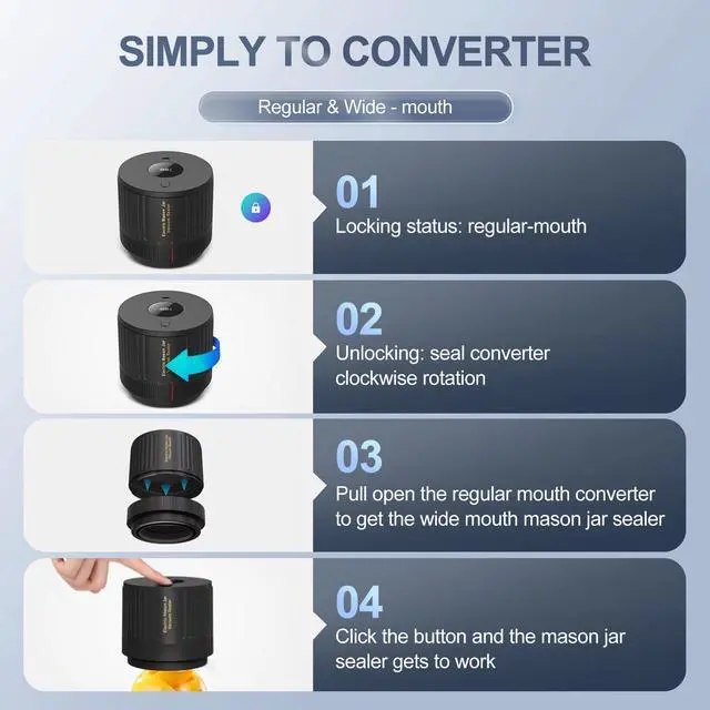 Easy to useThe Food Vacuum Sealer with Standard Mouth Sealer Converter Kit is suitable for wide mouth and regular mouth Mason jars (Mason jars not included). Make sure the electric vacuum sealer is centred and pressed firmly against the lid of the jar, click the button to start the vacuum pump for 40s or more and the air can be evacuated to the seal. Clicking the button again closes the sealer.