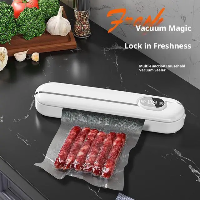 SOEWIOU automatic vacuum sealer in elegant gold color provides efficient vacuum sealing and preservation for various foods. It quickly removes air and creates an airtight seal to extend food freshness, prevent oxidation and freezer burn. Compact and easy to operate, perfect for home kitchen food storage, meal prep and sous vide cooking.