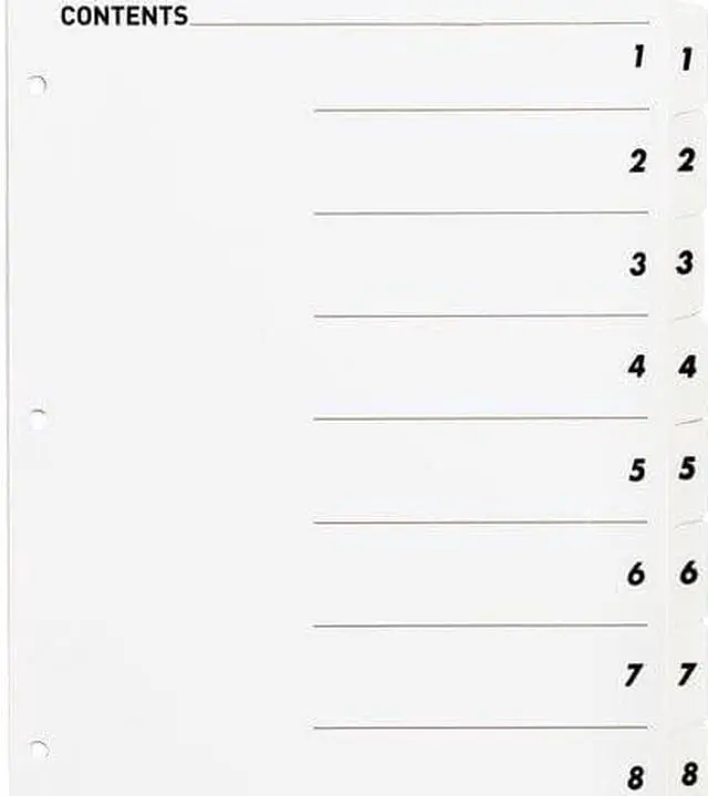 Make organization quick and easy using a black/white Table of Contents page that coordinates with included dividers with numbered tabs. Key in or type section titles, then print or copy onto the Table of Contents page preprinted with numbers that match the dividers. Edges and white tabs feature Mylar reinforcement to prevent tearing. Three-hole punched edges allow easy and quick placement into standard-size, three-ring binders. Index dividers are compatible with all laser and inkjet printers and include easy-to-follow instructions.
