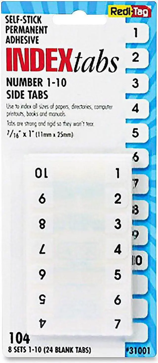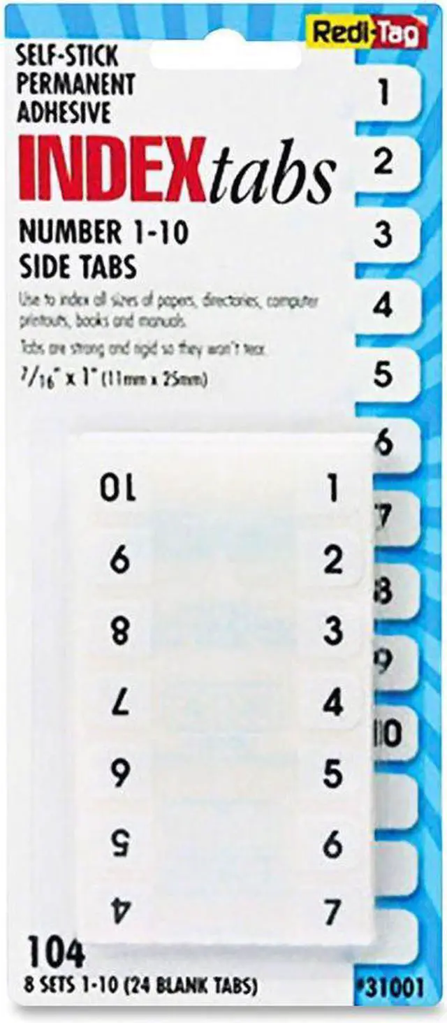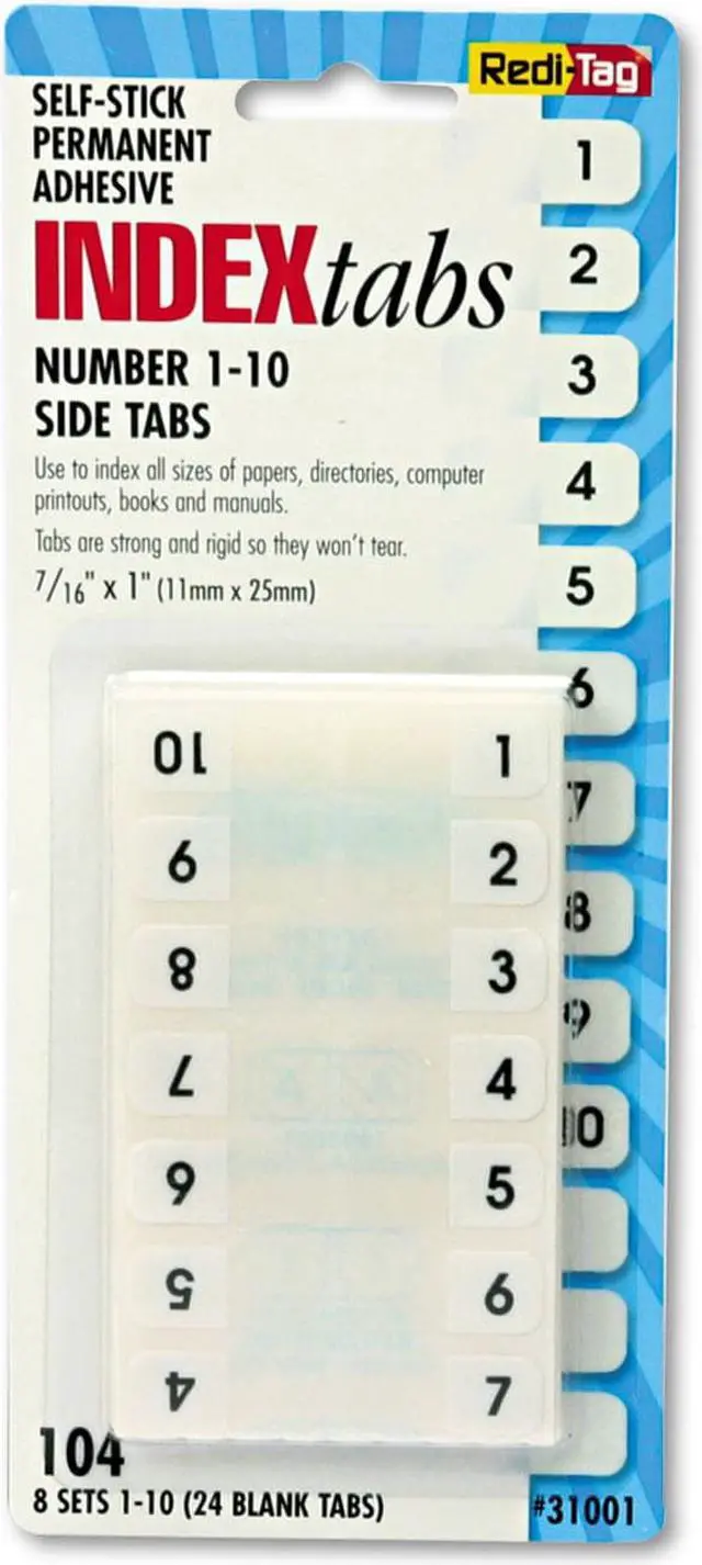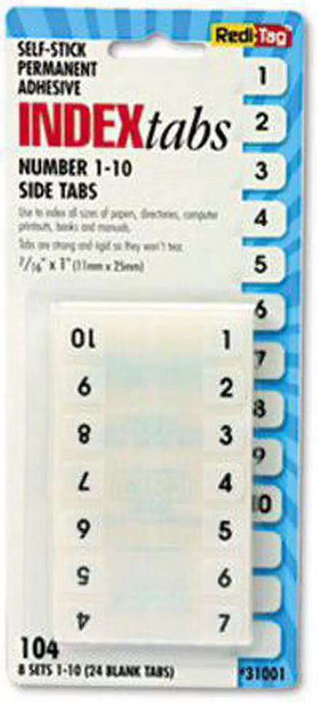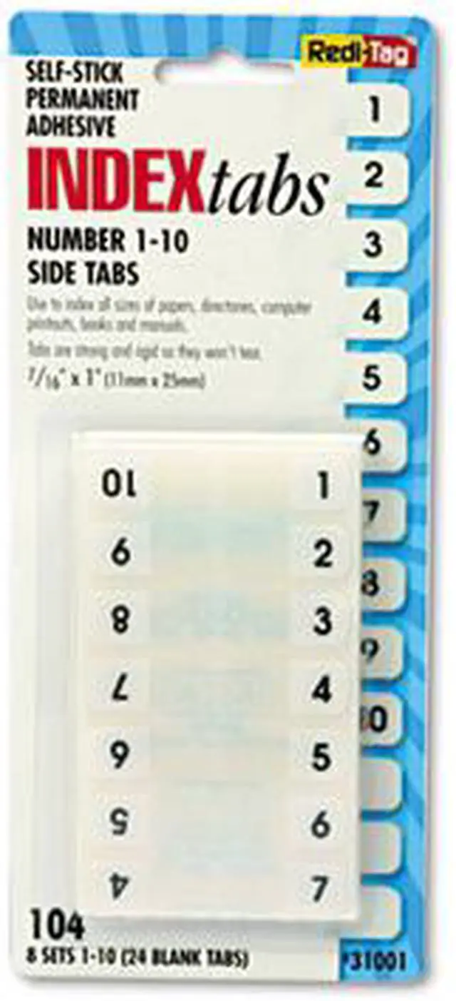 Heavy-duty plastic tabs wont curl or tear. Easy to read, just attach the to side of the page. Includes blank "write-on" tabs; preprinted numerical and alphabetical tabs. Permanent adhesive. 1" x 7/16". Preprinted Numeric TabsIndexed from 1 to 10. File Insert/Tab Type: Index Tabs; Tab Cut: 1/12-Cut; Color(s): White; Color Family: White.
