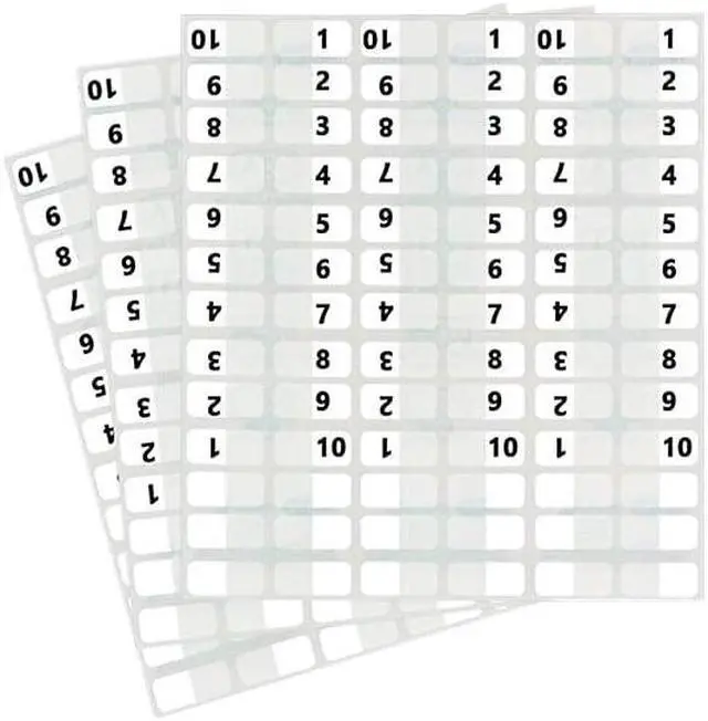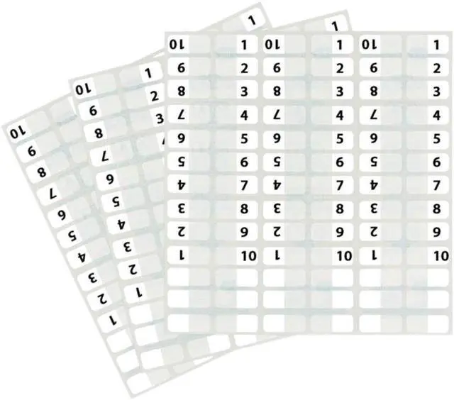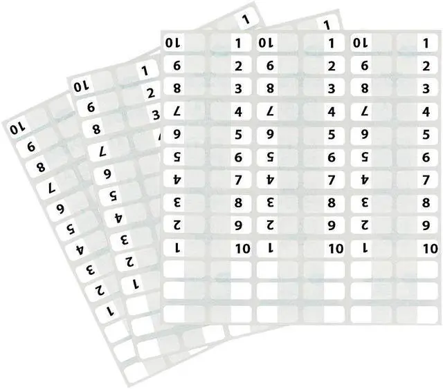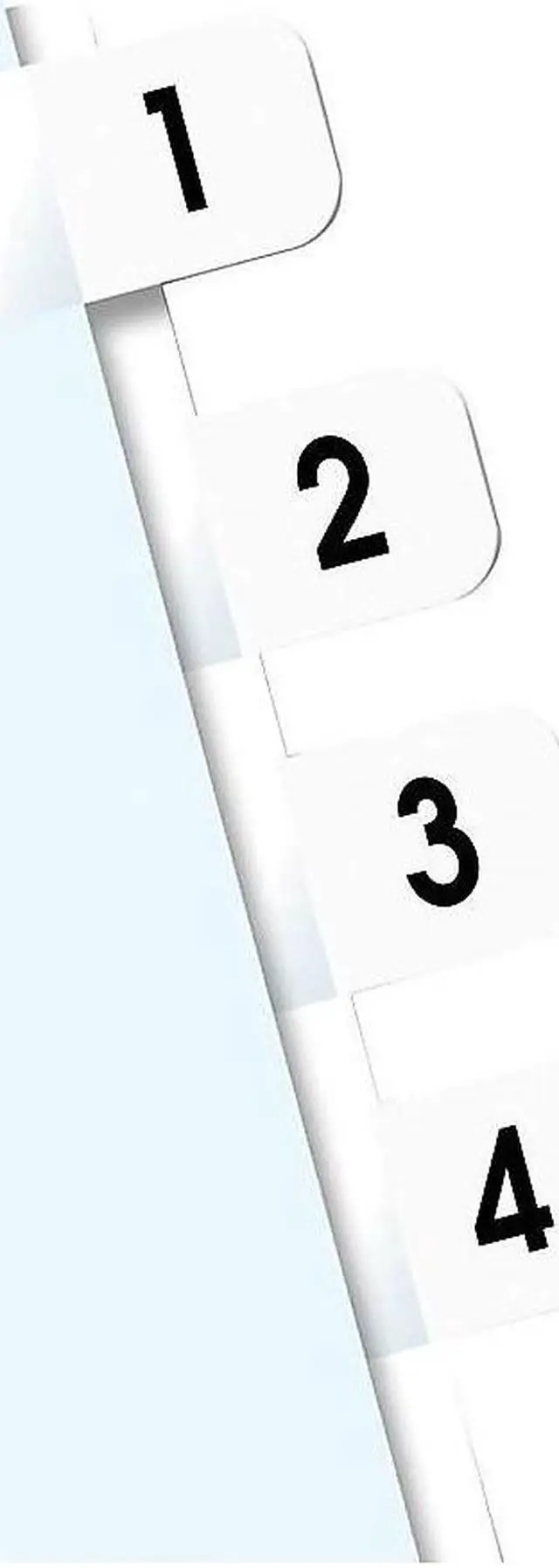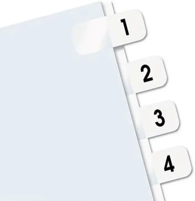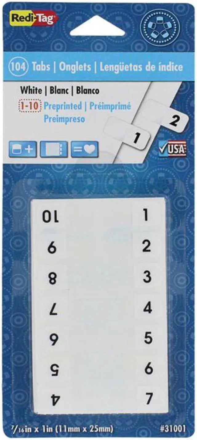 Heavy-duty plastic tabs wont curl or tear. Easy to read, just attach the to side of the page. Includes blank "write-on" tabs; preprinted numerical and alphabetical tabs. Permanent adhesive. 1" x 7/16". Preprinted Numeric TabsIndexed from 1 to 10. File Insert/Tab Type: Index Tabs; Tab Cut: 1/12-Cut; Color(s): White; Color Family: White.