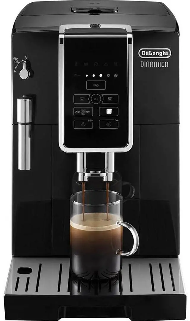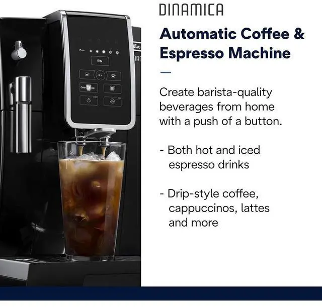 Factory RefurbishedProduct Description: The De’ Longhi Dinamica Black is a fully automatic bean-to-cup espresso and coffee machine designed to deliver café -quality drinks at home with minimal effort. It combines a built-in steel burr grinder, a manual frother, and a one-touch interface for creating hot or iced coffee, espresso, and more. The machine is streamlined for easy cleanup and user-friendly control, while its 60-oz water reservoir and robust build make it suitable for regular use. Whether you’ re craving a strong espresso or a refreshing iced coffee, the Dinamica has you covered with customizable drink sizes, strength, and settings.