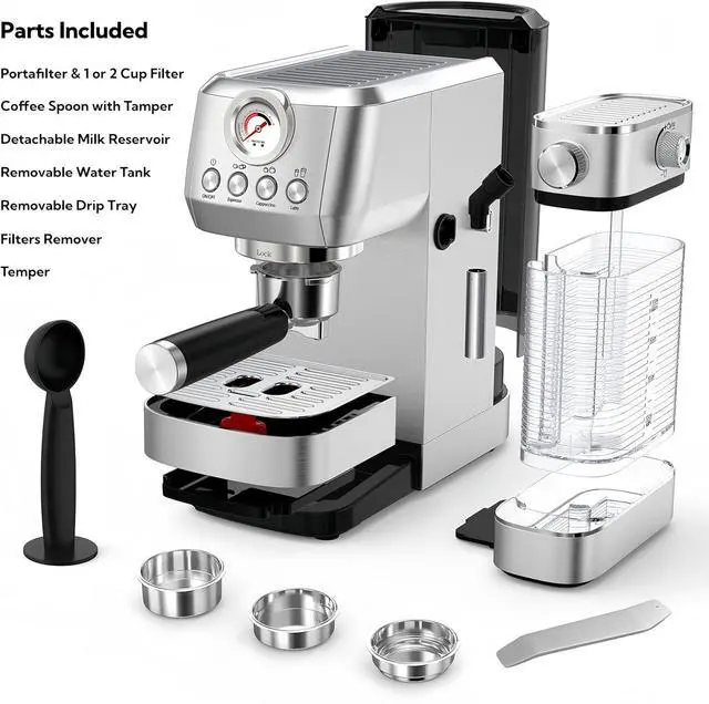 Space-Saving & Complete Bundle: Featuring a removable 47oz water tank and drip tray, this 0.03m³ compact cafe combines effortless maintenance with kitchen-friendly dimensions. It comes with a cappuccino maker, single/double and ESE cup filter, basket easy remover accessory, 51mm pointy portafilter, a metal coffee spoon with tamper