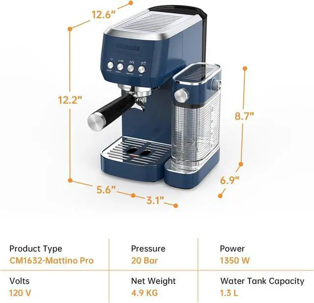 Space-Saving & Complete Bundle: Featuring a removable 47oz water tank and drip tray, this 0.03m³ compact cafe combines effortless maintenance with kitchen-friendly dimensions. It comes with a cappuccino maker, single/double and ESE cu