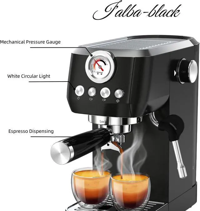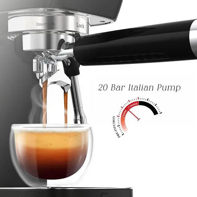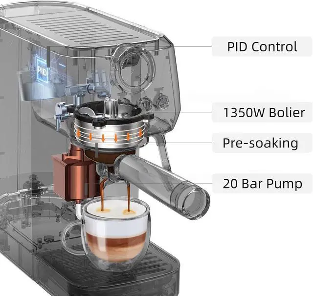Gradient Color Pressure Gauge: This semi-automatic coffee maker has a visual pressure gauge, its progressive design helps you explore the optimal extraction pressure, boasting a 20 bar high-pressure pump and 1350w boiler, combined with pre-soak technology, ensures a powerful extraction process for extracting the rich crema, maximizing the flavor of your coffee beans