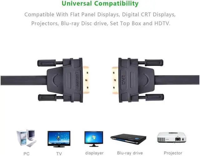 Connect your DVI-equipped computer or other source devices to flat panel displays, digital CRT displays, projectors, and HDTV with DVI-D Dual Link interface for video, gaming, conference or home theater Supports 120Hz refresh rate at up to 2560x1600 Supports digital signal only, and DVI does not support audio output With Triple shielding, ferrite core and gold-plated DVI-D connectors to optimize its performance and minimize cross talk, ensuring high-speed, error-free t Made of Oxygen Free Copper, 28AWG, OD: 8.5 mm Description 3ft/1m DVI-D 24+1 Dual Link Male to Male Digital Video Cable offers you a convenient way to connect your DVI-equipped computer or other source devices to flat panel displays, digital CRT displays, projectors, and HDTV with DVI-D Dual Link interface for video, gaming, conference or home theater. The slim DVI connectors with screws not only support secure connection, but also easy plugging & unplugging. Specification 1. DVI-D 24+1 Male to Male Dual Link Cable with slim connectors; 2. Supports 120Hz refresh rate at up to 2560x1600; 3. Supports digital signal only, and DVI does not support audio output; 4. With Triple shielding, ferrite core and gold-plated DVI-D connectors to optimize its performance and minimize cross talk, ensuring high-speed, error-free transmission; 5. Compatible with Flat Panel Displays, Digital CRT Displays, Projectors, and HDTV; 6. Made of Oxygen Free Copper, 28AWG, OD: 8.5 mm; Package Contents 3ft/1m DVI-D 24+1 Dual Link Male to Male Digital Video Cable 3ft x 1;