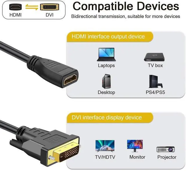 DVI to HDMI Adapter for Monitor Bi-directional HDMI to DVI-D (24+1) Cable 1080P Full HD DVI Male to HDMI Female Video Cord Gold Plated HDMI to DVI Converter Wire Compatible with HDTVs, Projector, Blu-ray Player, PS4/PS5 Game Console, DVD Player, TV Box, and other devices with HDMI and DVI-D interface. This DVI to HDMI adapter connects a computer with a DVI-D/HDMI port to a monitor, HDTV or projector with an HDMI/DVI port. Requires an HDMI cable (sold separately). AUDIO MUST BE TRANSMITTED SEPARATELY. (Audio is not supported on the DVI-D interface).