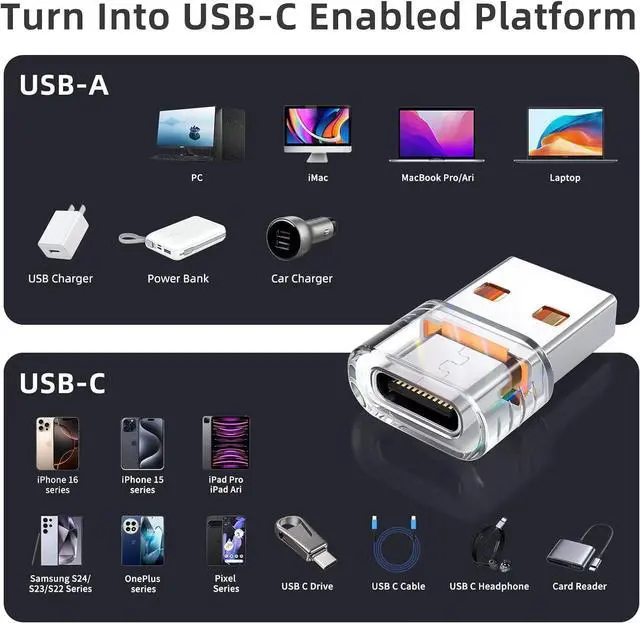 USB-C Adapter: Convert any USB-A port into a USB-C port with this USB to USB C adapter 5-pack. Compatible with iPhone 16 Pro Max Plus charger iPhone 15/14/13 Pro Max Watch Ultra iWatch 7/8/9/10 AirPods iPad Galaxy S24 and more. Easily charge and transfer data across your devices. High-Speed Data Transfer & OTG Support: This USB C to USB adapter supports data transfer speeds up to 480Mbps perfect for syncing files photos and videos quickly. The USB-A to USB-C converter allows easy content transfer between devices without delay. Fast Charging C Up to 3.1A: Supports fast charging up to 3.1A allowing devices like iPhone 16 iPhone 15 iPad and Watch Ultra to charge quickly and efficiently. Whether at home in the car or on the go this USB C charging adapter ensures a steady power supply.