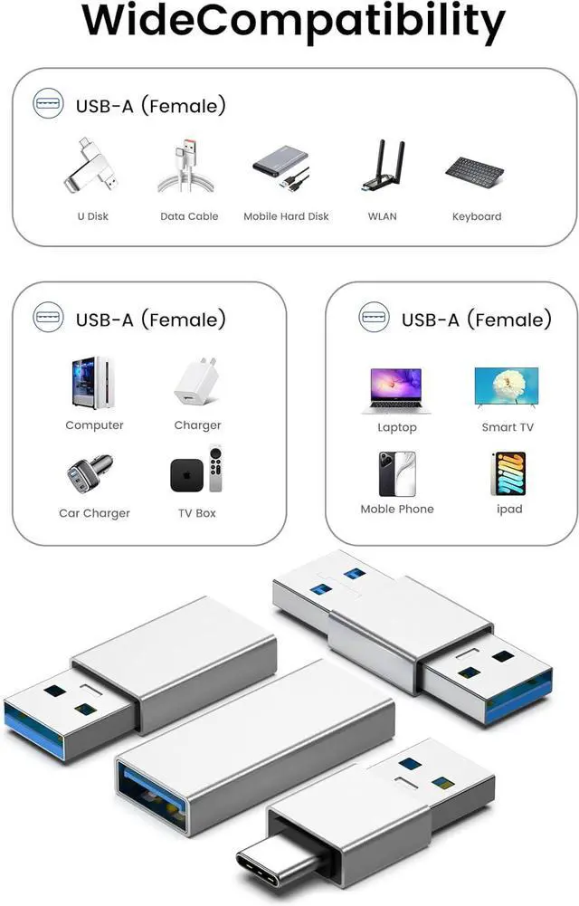 A Male-to-C Male Adapter: New and old devices are interconnected and traditional USB-A devices are directly connected to Type-C phones/laptops. USB 3.0 A Female to A Female AdapterDouble Female Connector Design Easily connect two standard USB A male cables for data transfer or charging expansion.