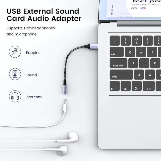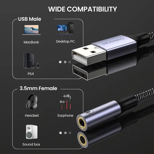 USB external sound card audio adapterThis USB to aux adapter supports listening and speaking Easily adds a 3.5 mm TRRS aux port integrated microphone-in and audio out interface to your devices. Wide CompatibilityUSB to 3.5 mm Jack Audio Adapter support TRRS headsets and microphones. USB male wide compatibility with Windows 10/9/8/7/Vista/XP Linux Mac OS X google Chromebook Raspberry Pi PS4 PS5 and Windows Surface 3 etc. Plug and PlayUSB Sound Adapter no driver required USB headset adapter plug and play; the durable nylon braided cable of the USB audio adapter ensures stable transmission and allows you to use your 3.5 mm headphones more conveniently.