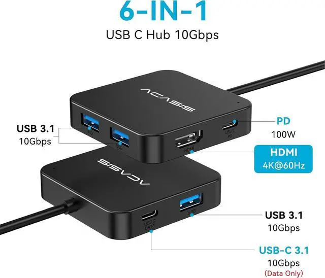 ACASIS 6 IN 1 10Gbps Type C to HDMI AdapterWith 4K 60Hz HDMI 3 USB A 3.1 1 USB C 3.1 and PD 100W USB C charging port this usb c adapter supports data transfer display expansion charging basically meet different ports needs. Notemake sure your computer type c port can support video transmission( USB 4.0 /Thouderbolt 3/Thouderbolt 3 can support)4K@60Hz USB C Hub HDMIMirror your screen to monitors or projectors for a large viewing this USB C to HDMI hub works for desktop laptop and mobile phones. ONLY 1 HDMI PORTEXPAND 1 MONITOR ONLYPD 100W Fast ChargingWith 100W Charging USB C port the usb c dock can charge your laptops/tablets/phone quickly when you using other ports.