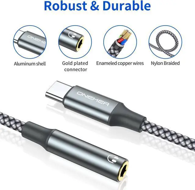 Sound Quality: This usb c to headphone adapter adopted an advance DAC Smart Chip offer high-definition audio powerful noise reduction you can get higher fidelity sound from itHigh durability: This Cable Can withstand More Than 20 000 Bending Tests Nylon Braided style not only let it look upscale and attractive but also provids maximum's durabilityWhat you get 2-Pack: OneKer We provide this 2-Pack USB Type C to 3.5 mm Female Adapter worry-free two years Any question do contact our customer support team we will response within 24 hours by email