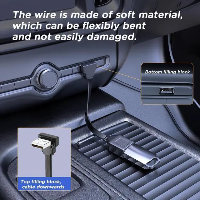Space-Efficient 90-Degree Cable: This cable's small USB plug is perfect for cramped spaces and works with all USB interfaces found in cars.