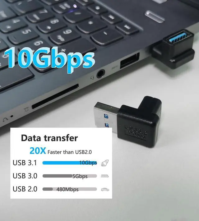 Degree Angle Design: Which can avoid the wear of the cable and the input port of the device. Good solution for cable connection in narrow places prevent cable bending and prolong the cable's service life. USB Adapter10Gbps Data Transfer & Fast Charging: USB 3.2 Adapter High speed 10Gbps data transfer Transfers movies music and more in just seconds. and also supports up to 5V/ 3A of power output. Providing your device with the fastest possible charging. Extension Power Data