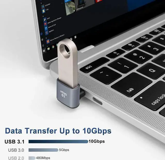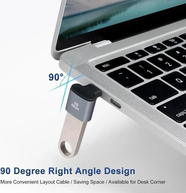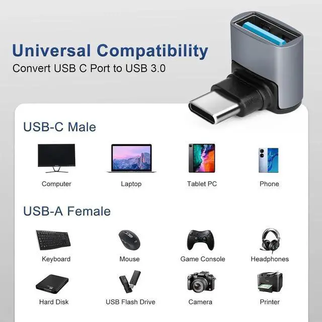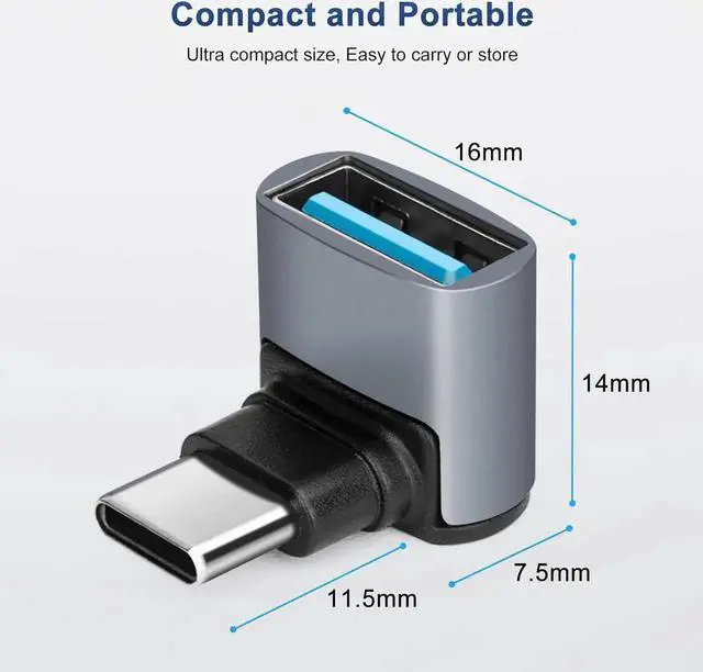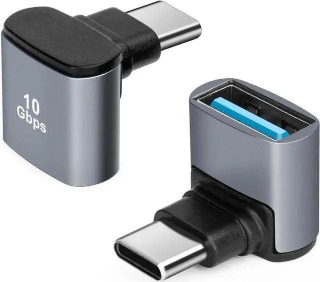 ? Right Angle DesignUSB C Male to USB A Female 90 Degree Right Angle Adapter for tight spaces near walls avoiding wear and tear on cables and device input ports.? USB 3.0 10GbpsUSB Female to USBC 3.1 Male Adapter supports up to 10Gbps data transfer speed which allows you to quickly transfer files and movies in a short period of time.? Wide Compatibility90° USB C to USB 3.1 adapter allows you to connect USB C devices (USB C cables/memory sticks/USB C hubs) to a laptop/charger with a USB-A port.? Plug and PlaySupports OTG function ideal for transferring data between computer peripherals and mobile devices; make sure your device supports OTG.