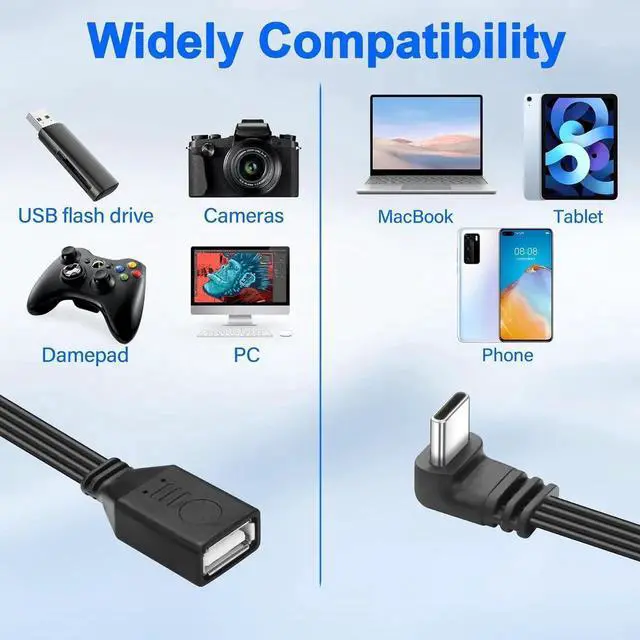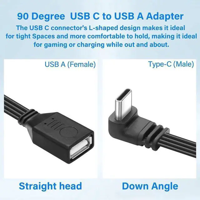 Specification: USB Type C 2.0 short charging cable the cable length is 30CM ( 11.8 inches) short and lightweight perfect for carrying. Charge USB C port devices via any mobile phone charger portable charger or multi-port USB charger. USB C to USB A female short cable supports 480Mbps transfer rate maximum current 2A laptop external USB flash drive/card reader/hard drive for fast reading and transferring files fast speed save time and worry. The USB C silicone flat short cable is designed with 90 degree right angle which can reduce the stress on the cable and device USB-C port space-saving easy to bend and easy to wire in narrow spaces. Type C to USB Female OTG