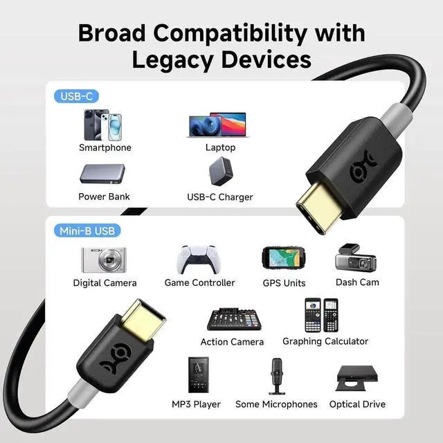 Broad Compatibility: This USB Mini B to USB C cable works with MP3 players Canon PowerShot cameras PS3 controllers Garmin and TomTom GPS units GoPro Hero cameras car dash cams Blue Snowball iCE USB Mic Blue Yeti USB Microphone Graphing Calculator TI-84+ CE and more.