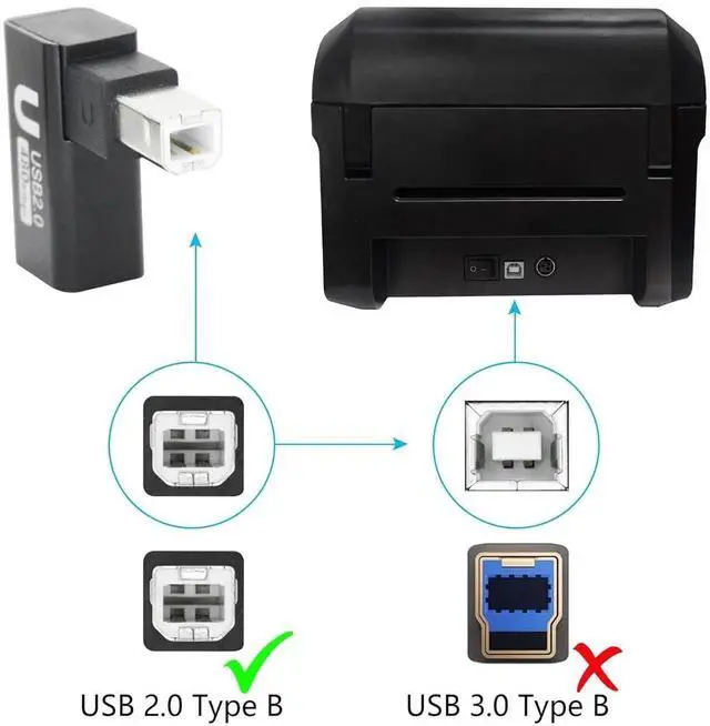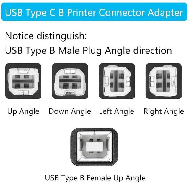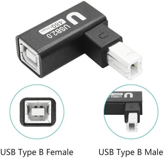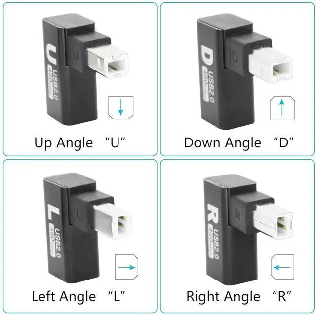 Please NoteThe direction we define may be different from what you understand choose the appropriate angle for your device based on the narrow side of the USB Type B Connector (Plug) As Left Angle Right Angle Up Angle or Down Angle. Right Angle DesignThis 90 degree printer adapter allows the cable to have a suitable extension direction which can avoid the wear of the cable and the input port of the device solve limited connectivity between devices prolong the service life. High Speed TransferUSB Type B 2.0 male to female extender connector support 480Mbps data transfer backward compatibility with USB 1.1 and low speed USB 1.0 this adapter offers you a better and more efficient way of working.