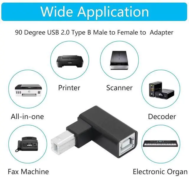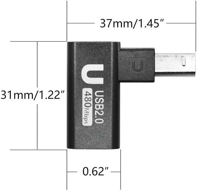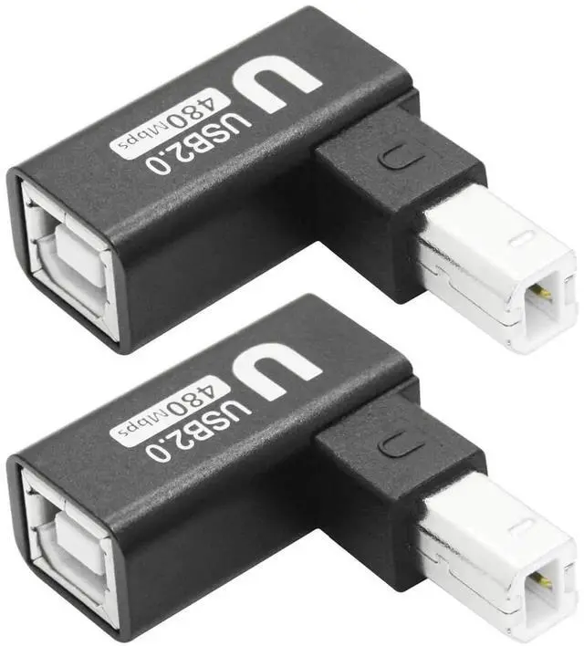 Durable and Portable90 Degree USB B 2.0 Printer adapter the shell is made of aluminum alloy featuring heat dissipation wear resistance and other characteristics. Small size light weight it is convenient to carry. Widely CompatibleUSB B 2.0 printer adapter widely for Printers s Fax machine or with MIDI port electronic musical instruments such as Electric pianos Keyboards Drums and Mixers.