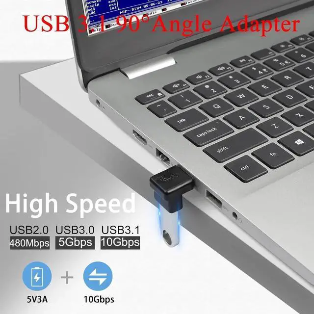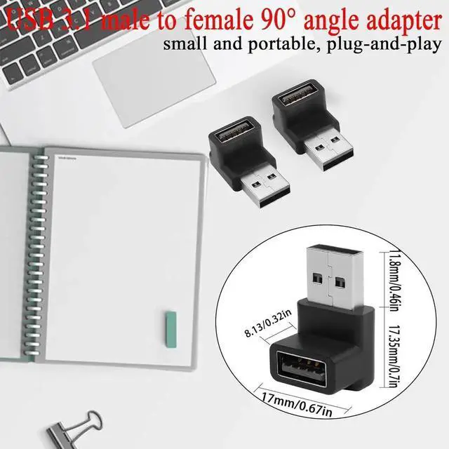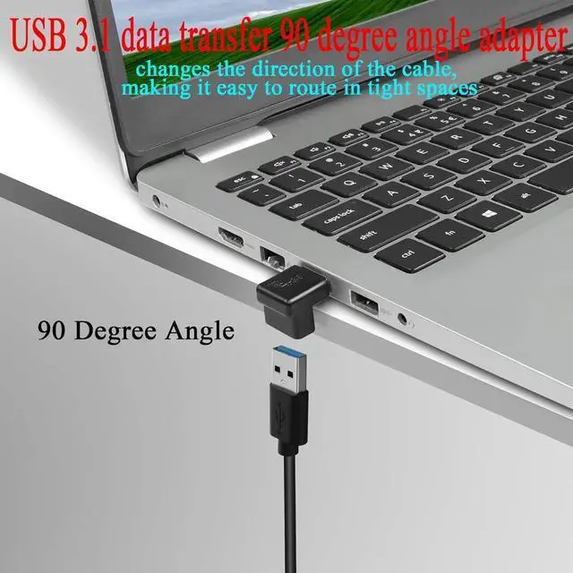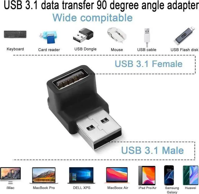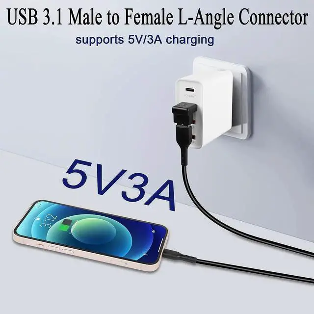 USB 3.1USB 3.1 male to female 90 degree angle expansion adapter. Data transfer up to 10Gbps external high-capacity hard drive easily copy large files. Backward compatible with USB 3.0 / 2.0 / 1.0 supports 5V/3A charging. 90° angleUSB 3.1 male to female 90° angle adapter. The L shape design with the female end down changes the direction of the cable making it easy to route in tight spaces. Extension ProtectionUSB 3.1 L-angle adapter. Easily extends to protect the ports of your PC laptop tablet mobile power or other USB devices. Can be left in a USB port without causing interference.