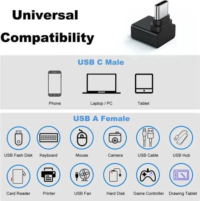 Up and Down Angle Design This USB C to USB adapter adopts a vertical 90 degree L-shape design which is convenient for use in a narrow space. USB cable and other USB devices are easier to connect.