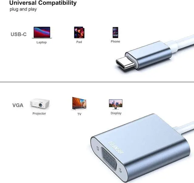 COMPACT DESIGN - The compact-designed portable Benfei USB-C to VGA adapter connects a computer desktop laptop or other devices with USB-C port to a monitor projector HDTV or other devices with VGA port; Tuck this lightweight gadget into your bag or pocket to do a business presentation with your laptop and projector or extend your desktop screen to a monitor or TV; A VGA cable is required. SUPERIOR STABILITY - Built-in advanced IC chip converts USB-C digital signal to VGA signal; The USB Type-C source should supports the USB Type-C DP Alt Mode (video output function).