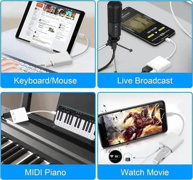 Adapter Multiple Use: Denlane OTG adapter for iphone with usb female not only for reading camera and USB flash drives date but also supports connecting various USB peripherals for iphone/ipad such as keyboard Mouse USB microphones midi piano etc. This usb adapter can improve work efficiency watching movie easier two-way transmissionCharging for iPhone/iPad: The usb to lightning adapter expand a lightning charging port no need to worry about running out of battery when using. Surprisingly the usb to lightning cable adapter support sharing battery power with your friends to solve the urgent needs.