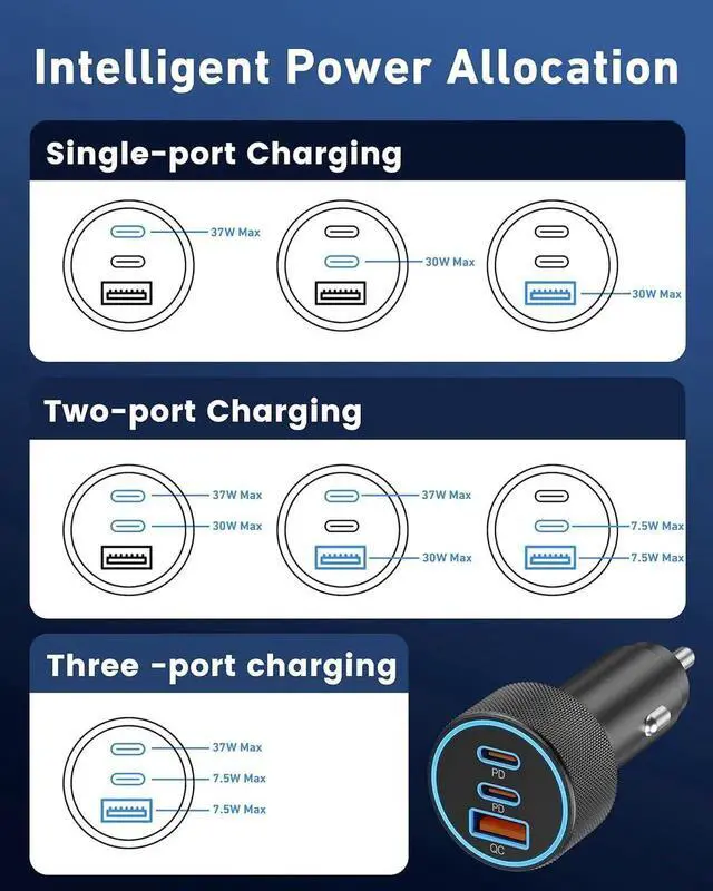 Fast Car Charger: KENHAO 67 Watt USB C car charger support PD 37W Max (USB C) and QC 30W Max (USB-A) output can fast charge for most USB-A and USBC devices simultaneously; One car charger for all your USB A & USBC devices your ideal travel companionFast