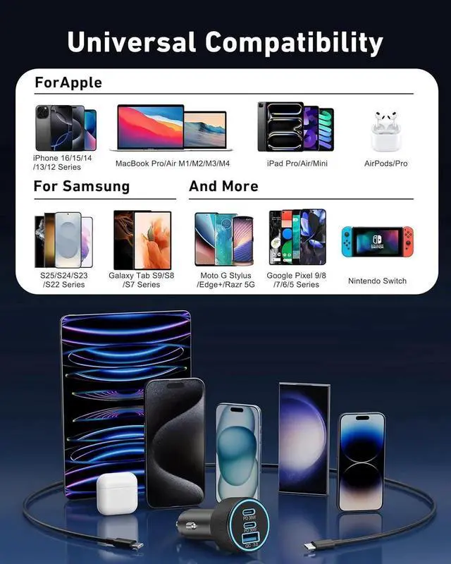 Compatibility: Car phone charger with Two USB-C and One USB-A Port output can charge almost all USB Devices compatible with iPhone 16/16e/15/14/13/12 XS/XR/X/8/7/6 iPad Galaxy S25/S24/S23/S22/S21 Note 20/10/9 Google Pixel 8/7/6/5 AirPods Smart watches driving recorder GPS navigation car vacuum cleaner power banks and other devices.