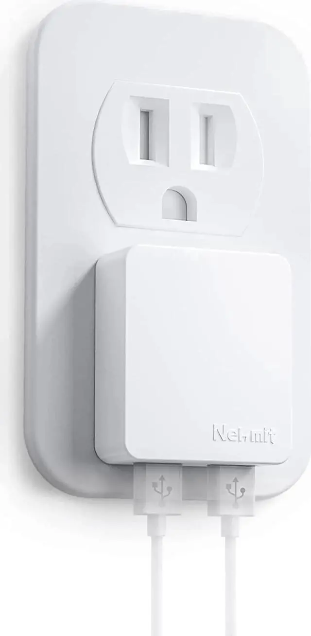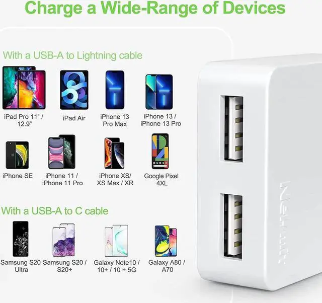 Ultra slim dual port design allows you to charge 2 devices simultaneously lightweight and portable easy to storeSmart IC technology auto-detects your device's output to always charge at maximum speed. 12 watts maximum output on either portMulti-protect safety system and 3-prong (NOT Grounded) design with high-temperature high-current and over-charging protectionAllows other outlet port (s) to be accessible at any timeThin usb wall charger is compatible with the iPhone 15/14/13/12 Series tablets Airpods Nintendo Switch and more