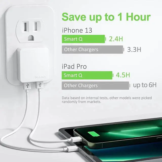Ultra slim dual port design allows you to charge multiple devices simultaneously lightweight and portable easy to storeSmart IC technology auto-detects your device's output to always charge at maximum speed. 12 watts maximum output on either portMulti-protect safety system and 3-prong (NOT Grounded) design with high-temperature high-current and over-charging protectionAllows other outlet port (s) to be accessible at any timeThis adapter plug is compatible with the iPhone 15/14/13/12 Series tablets Airpods Nintendo Switch and more