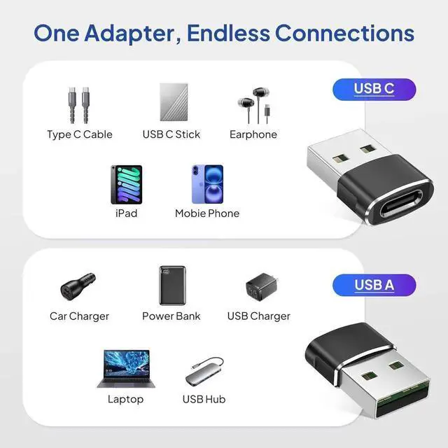(Read before You Buy) Be aware that these adapters are not suitable for video exportation and cannot be used with cables adapters or docking stations that provide video output with the exception of webcams. Nevertheless they are fully capable of charging devices duplicating files and can be seamlessly integrated with USB-C earphones wireless network adapters and SD card adapters. (Gap Bridged) Need to plug your USB-C enabled device to your quaint devices that only have USB-A ports? Then these USB-A Male to USB-C Female adapters are made for you. Simply plug the adapter into the USB-A port of your device and you can instantly connect your USB-C peripherals to the device that originally did not have the right connection interface.