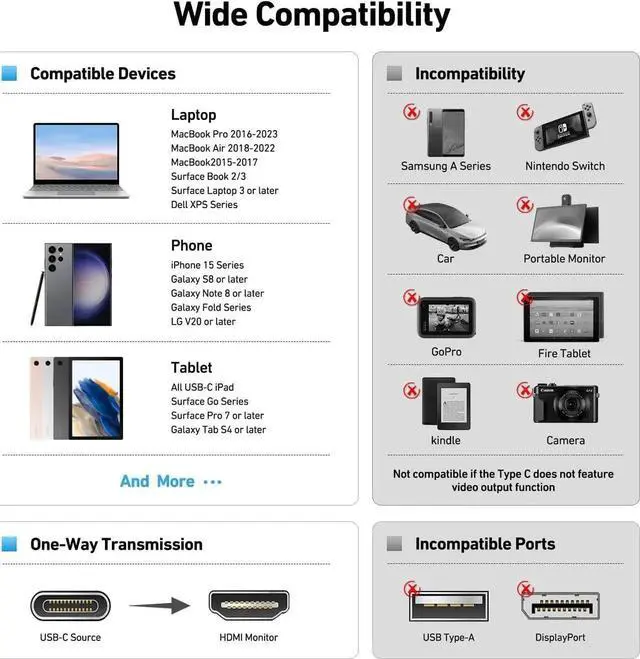 COMPACT DESIGN - The compact-designed portable BENFEI USB-C to HDMI adapter connects a computer desktop laptop or other devices with USB-C port to a monitor projector HDTV or other devices with HDMI port; Tuck this lightweight gadget into your bag or pocket to do a business presentation with your laptop and projector or extend your desktop screen to a monitor or TV; SUPERIOR STABILITY - Built-in advanced IC chip converts USB-C digital signal to HDMI signal; Please pay attention the USB-C device should support the USB Type-C DP Alt mode. INCREDIBLE PERFORMANCE - The USB-C to HDMI adapter supports resolutions up to 3840*2160@60Hz including 3840*2160@30Hz 2K@144Hz 1080P 720p 1600x1200 1280x1024 for high definition monitors or projectors; Plated USB-C connector resists corrosion and abrasion and improve the signal transmission performance; Molded strain relief increases cable durabilityBROAD COMPATIBILITY - The BENFEI USB-C to HDMI is compatible with iPhone 15 Pro/Max 13/15 MacBook Pro/Air iMac 2023 2022 2021 2020 2019 Google Chromebook Pixel Yoga 900 XPS 13 (9350) XPS 15 9550 XPS12 9250 Precision 5510 HP Spectre X2 HP Spectre x360 HP Elitebook Folio G1 HP Elite x2 1012 G1 Switch Alpha 1 Spin 7 Chromebook R13 Chromebook Plus Galaxy TabPro S Galaxy A7 2017 LG G5 LG V20 HTC 1018 MONTH WARRANTY - Exclusive BENFEI Unconditional 18-month Warranty ensures long-time satisfaction of your purchase; Friendly and easy-to-reach customer service to solve your problems timely Compare with similar items