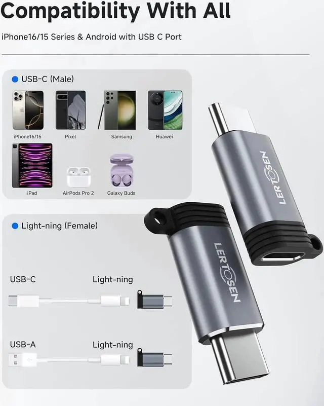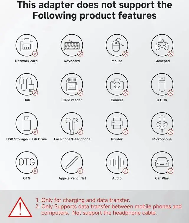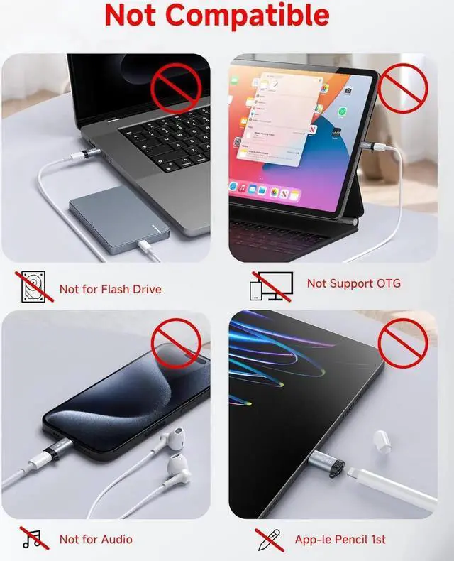 You Buy: The iPhone 15/16 charger adapter lightning to USB C adapter (4 Pack) can charge and data sync only between your phone and computer. Not support OTG video and audio functions listen to music headphones wired earphones or earbuds car play app Not for Pencil (1st gen) flash drive u disk sd card reader square reader printer microphone camera mouse keyboard Hubs HDMI converter etcSupport