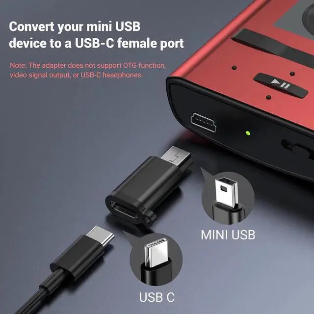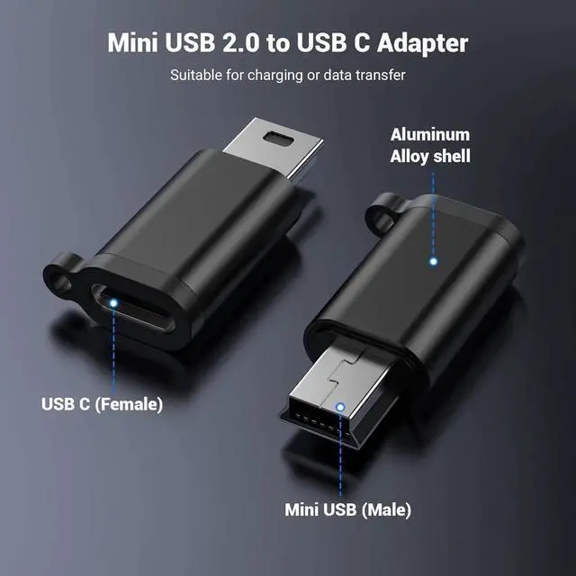 Mini USB to USB C AdapterThis usb c to usb mini adapter can convert your mini USB device into a USB-C female port so you can connect the USB-C cable to the mini USB device for charging and transferring data. Charging & Data TransferThe mini USB 2.0 adapter supports charging up to 2.4A and supports data transfer speeds of 480Mbps.
