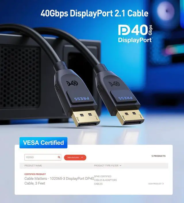 ![Alt view image 5 of 7 - [VESA Certified] 40Gbps DisplayPort 2.1 Cable 1m/3.3ft, DP40 Cable 8K 120Hz, 4K 240Hz in Black with FreeSync, G-SYNC and HDR for Gaming Monitor, PC, RTX 4080/4090, RX 7900](https://c1.neweggimages.com/productimage/nb640/C5TPD260326055OJN95.jpg)